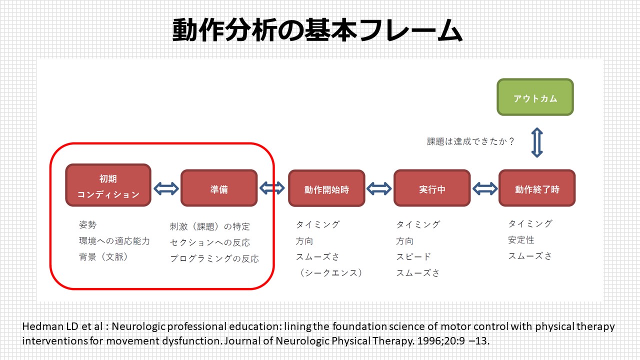 動作分析は①開始姿勢②動作実行中③終了姿勢を中心に行われますが, Hedman(1996)らは初期コンディションの重要性を述べています.→論文によるエビデンスはこちらから