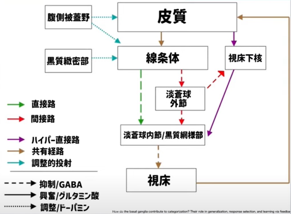 大脳基底核との相互作用:STNは淡蒼球(内節・外節)、尾状核、被殻、黒質などの大脳基底核の他の構成要素と複雑に連絡しています。これらの接続は、運動制御を調節する直接路および間接路の一部を形成します。