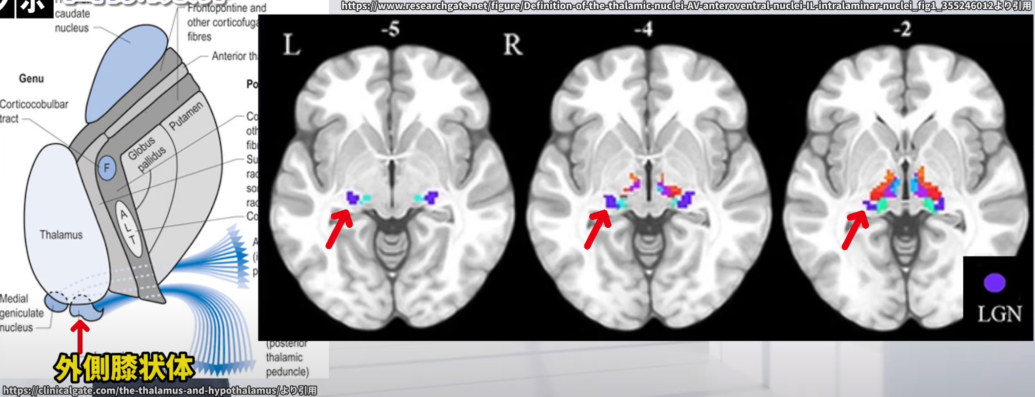 そのため、視床後方のスライスに注目して画像を確認することが、LGNを見つけるための有効なアプローチとなります。