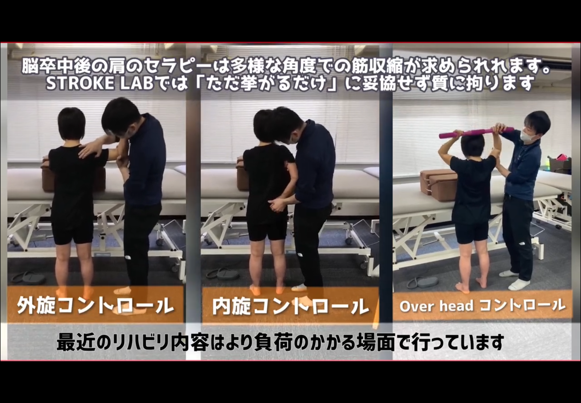 ※以下の動画・画像は脳卒中(脳出血・脳梗塞)の患者さんの肩に対するリハビリ事例ですが、丁寧な問診、評価→介入→再評価→評価に基づき適宜方向性を調整しながら介入→自主トレへといった流れは、脳腫瘍の術後障害と多くの共通点があります。アプローチの考え方は脳腫瘍にも応用しています。