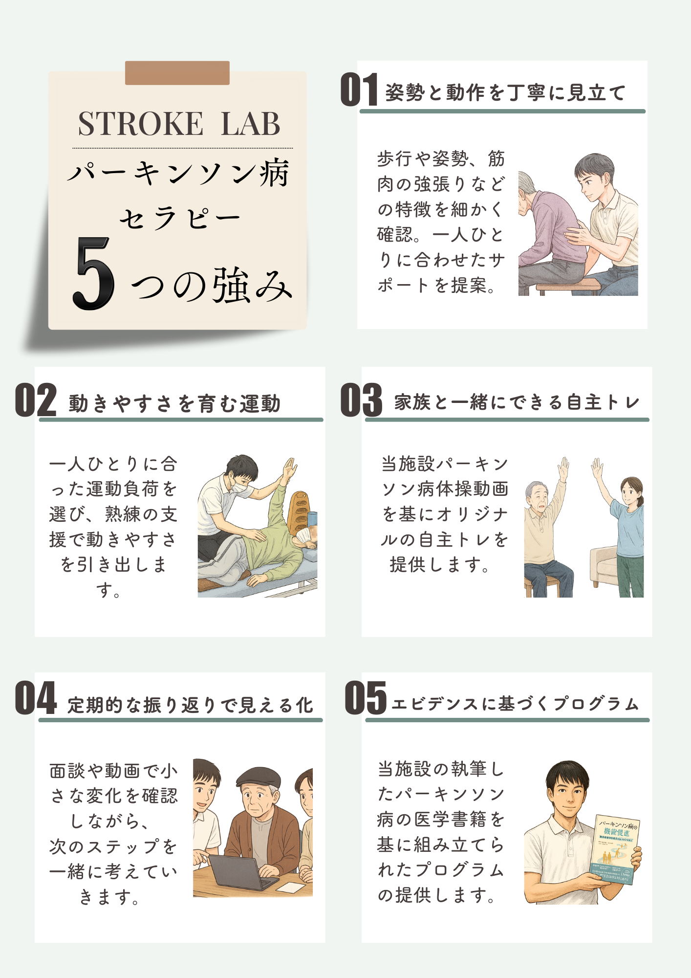 ◇パーキンソン病の動きにくさは「忘れてしまった」わけではなく、脳と身体の連携がスムーズに働きにくくなっているだけです。STROKE LABでは、その可能性に最短距離でアプローチします。 姿勢や筋緊張を丁寧に評価し、適切な負荷での運動学習によって「動きやすさ」を楽しく再獲得。本人もご家族も変化を実感しやすい設計だから、モチベーションが自然と高まります。