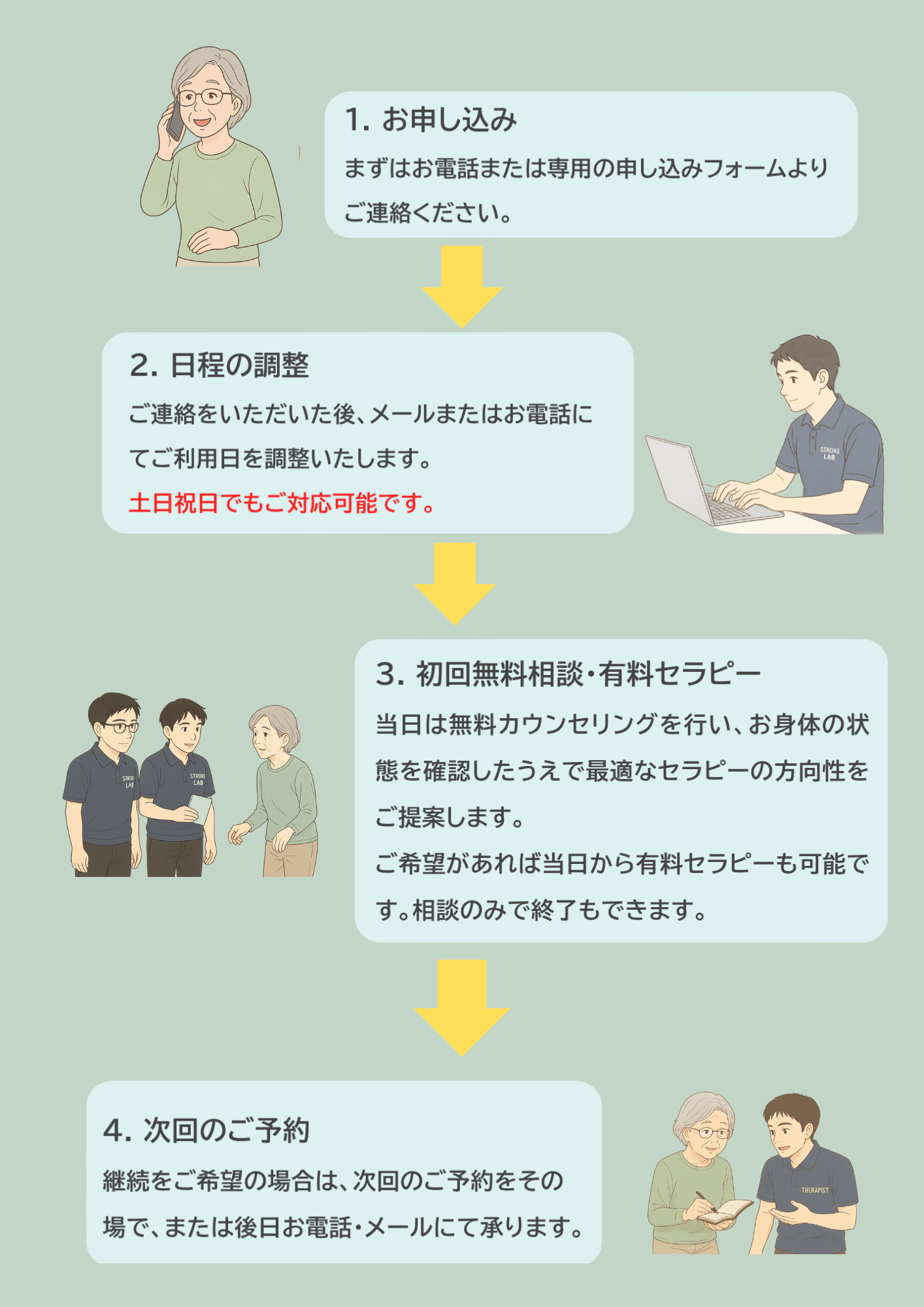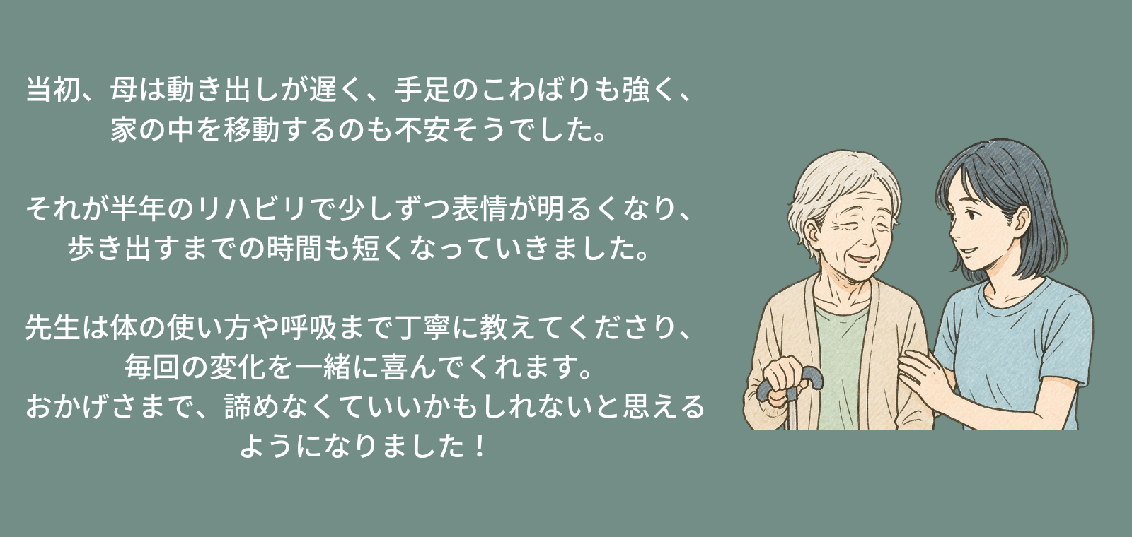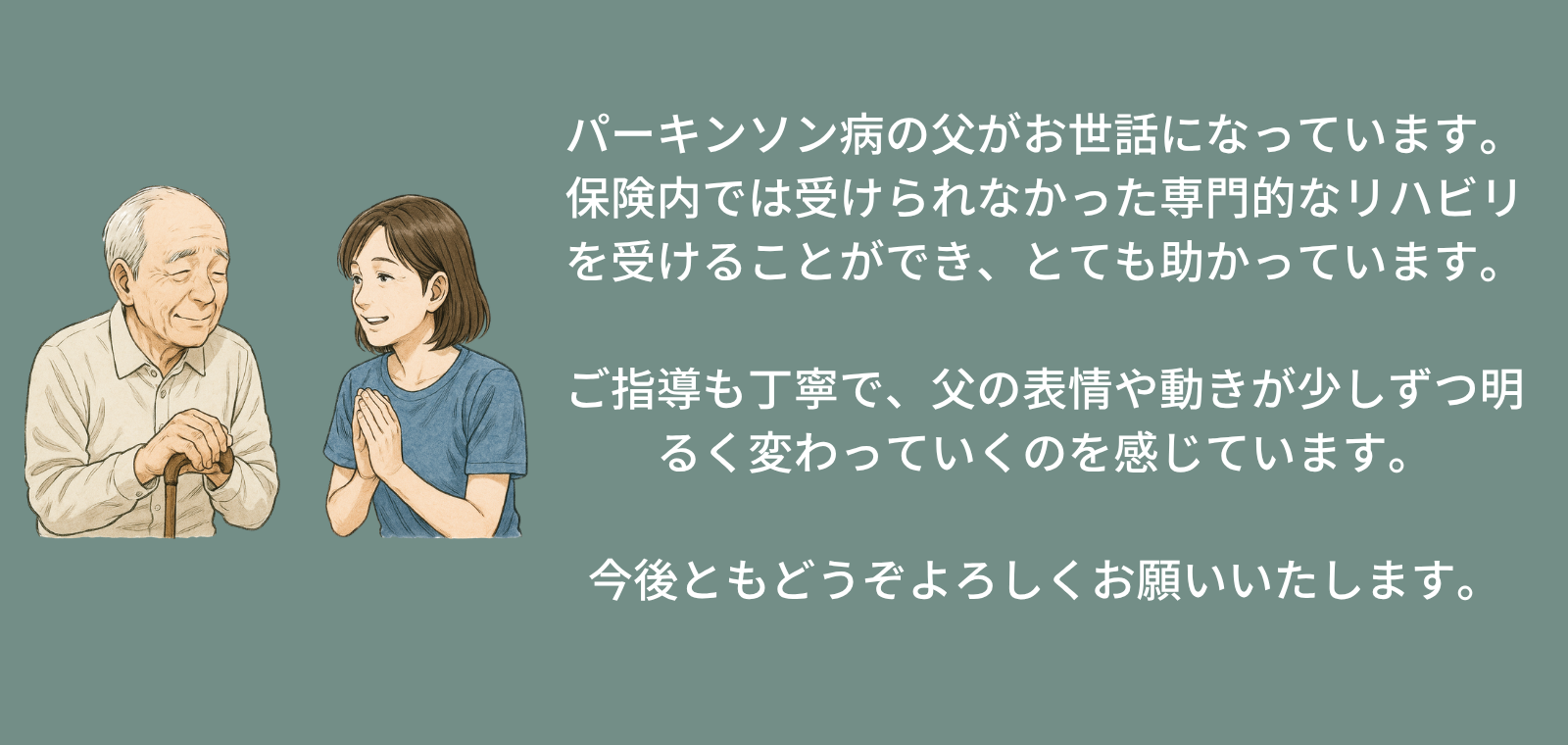 - 医療保険リハビリとの併用事例多数。初回だけ試す利用も歓迎