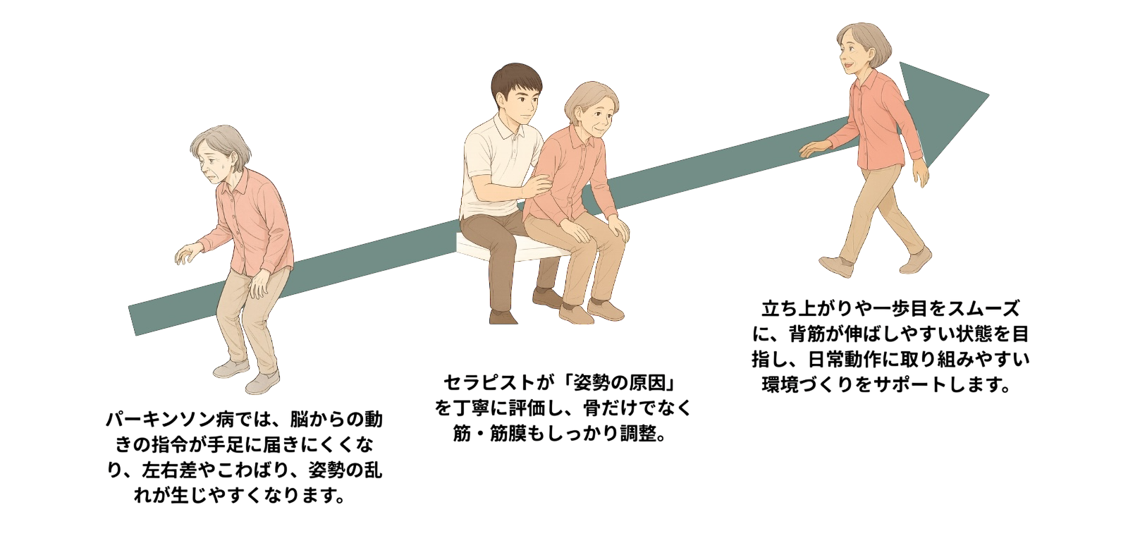 ◇パーキンソン病では、脳からの「動いて」という信号が手足にうまく伝わらず、病気の進行に伴って左右差も生じます。その結果、筋肉や筋膜の硬さ・ねじれ、姿勢の崩れが動きにくさを引き起こします。こうした緊張やこわばり、姿勢の乱れが、歩行・立ち上がり・着替えといった日常動作に大きな負担となり、患者さまやご家族を悩ませます