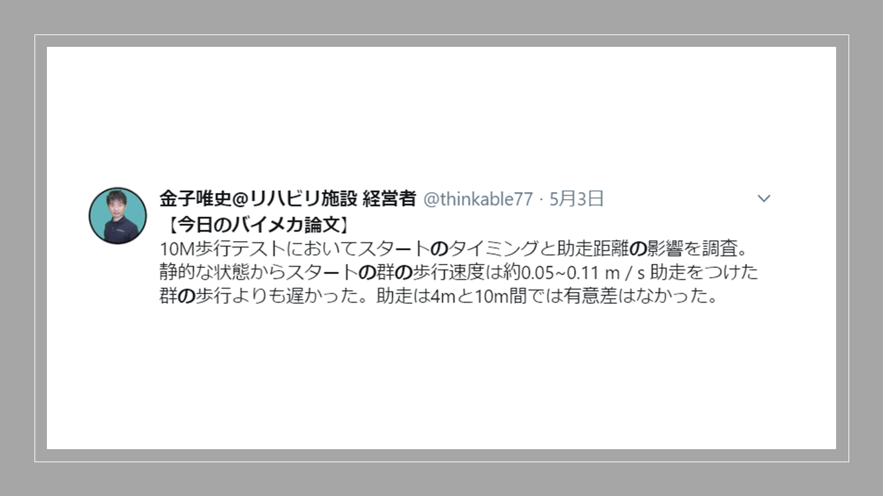 ●原著はInfluence of Timing Protocols and Distance Covered on the Outcomes of the 10-meter Walk Testこちら