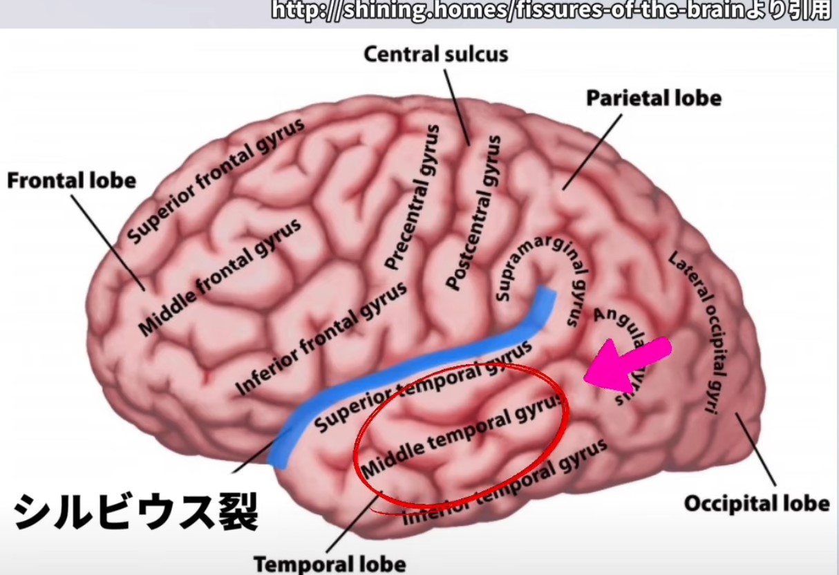 **中側頭回(Middle Temporal gyrus: MTG)**は、脳の側頭葉に位置する重要な領域です。側頭葉には3つの回があり、上側頭回、中側頭回、下側頭回が含まれます。中側頭回は、上側頭溝と下側頭溝の間に位置しています。